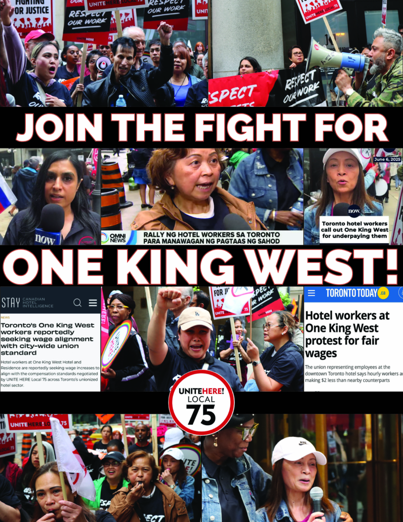 UNITE HERE Local 75 members are calling on One King West Hotel and Residence to match the industry-leading standard won by our hotel members across Toronto. Last Thursday, hotel workers from all over our city rallied in front of the hotel, on Melinda Street. See press below: